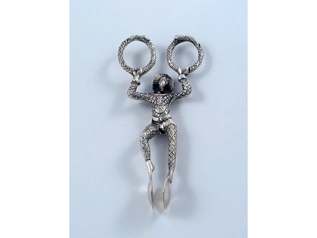 A pair of late 19th century continental sugar nips, cast in the form of a Harlequin, indistinct marks, 4.5in (9.2cm).
