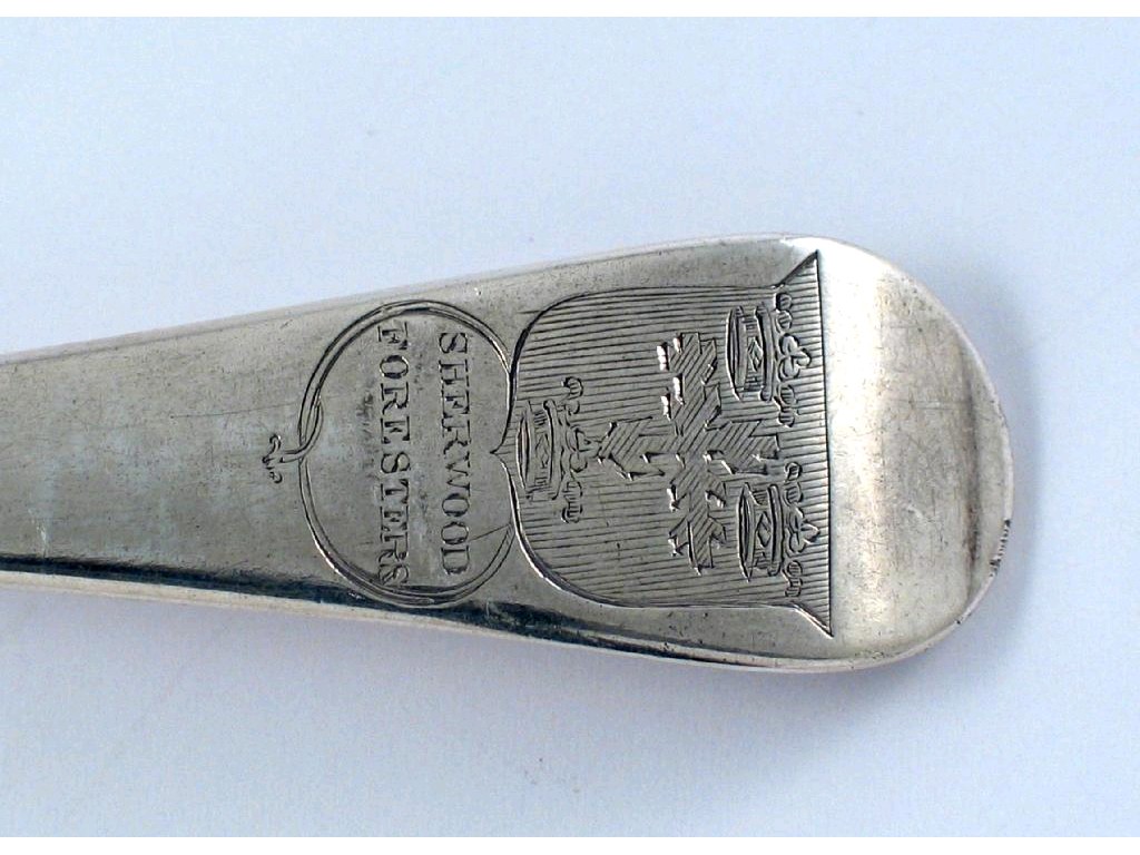 Regimental interest: a pair of George III Old English pattern tablespoons engraved with the badge of the 'Sherwood Foresters' (Nottinghamshire and Derbyshire Regiment) by Peter and Ann Bateman, London 1796, 3.5oz. (2)