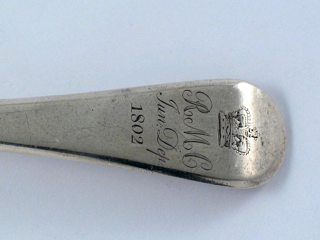An intersting set of four George III Old English pattern tablespoons, inscribed 'RMC' Jun: Dep 1802 - Infirmary' * below the Royal Crown by W.Eley and W. Fearn, London 1803/07, 10oz. (4)