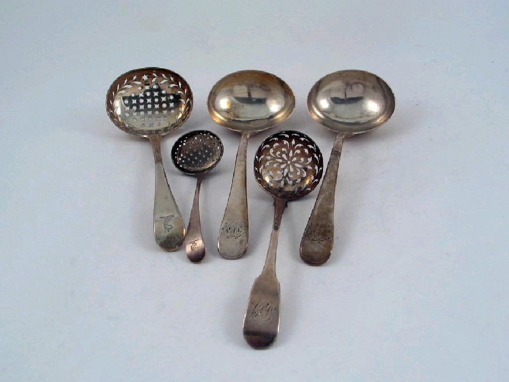Five assorted ladles: a pair of Old English sauce ladles by Solomon Hougham, London 1804, a William IV sugar sifter ladle crested, London 1832, a condiment ladle crested, London 1803 and a Scottish toddy ladle with a pierced bowl, 6oz. (5)