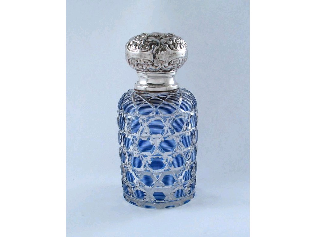 An Edwardian mounted toilet water bottle, flashed with blue linear decoration, embossed hinged cover, Birmingham 1906, 5.3in (13.5cm).