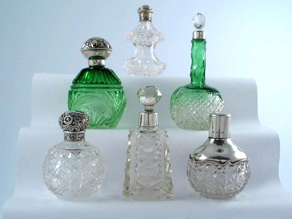 Four assorted clear glass and three coloured glass mounted scent bottles. (7)