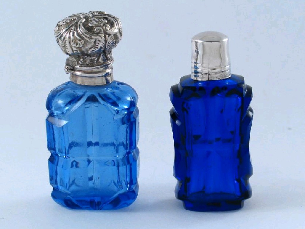 Two small mounted blue glass scent bottles. (2)