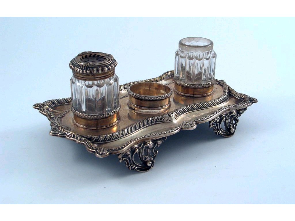 A William IV inkstand, with two fluted glass ink bottles (lacking a third) and only one mount, shaped borders and pierced feet, makers mark 'RG' possibly by Robert Gainsford, Sheffield 1830, pin (23cm) wide overall, 13oz weighable silver.