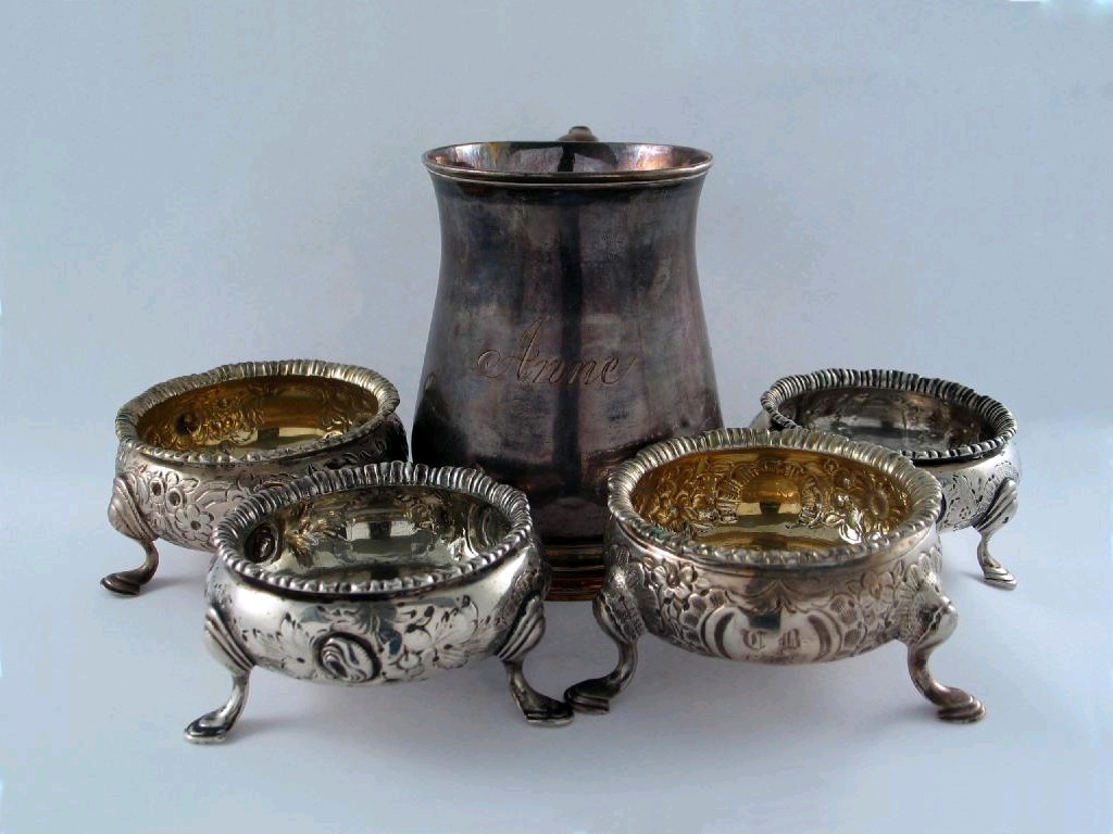 A George II mug, inscribed 'Anne' London 1738 and four assorted embossed salts on three feet, mixed makers and dates, 1742-1853, 12.5oz. (5)