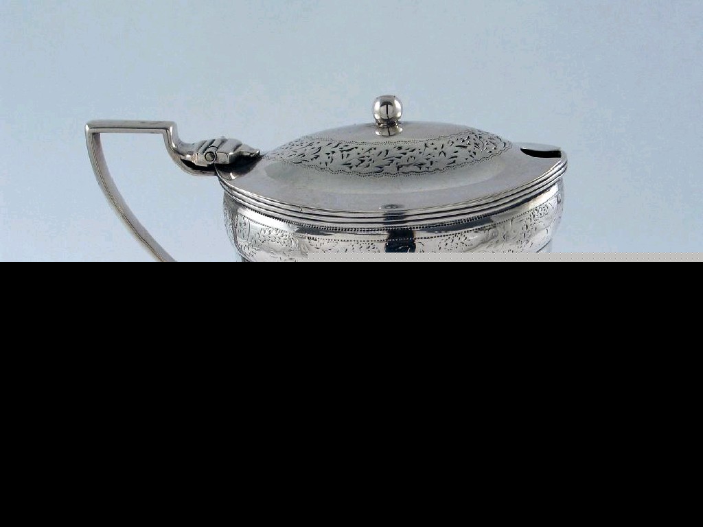 A George III engraved oval mustard pot, with reeded borders and a later glass liner, by John Emes, London 1801, 2.75in (7cm) high, 3.75oz weighable silver.