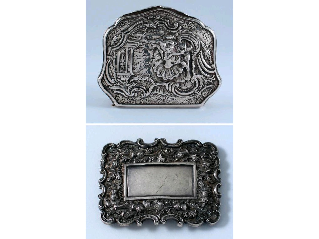 A Victorian Scottish buckle with a scroll border, embossed with thistles around a plain oblong cartouche, maker's mark only, "AF", unascribed, c.1890, 2.6in (6.7cm) wide, 1oz.