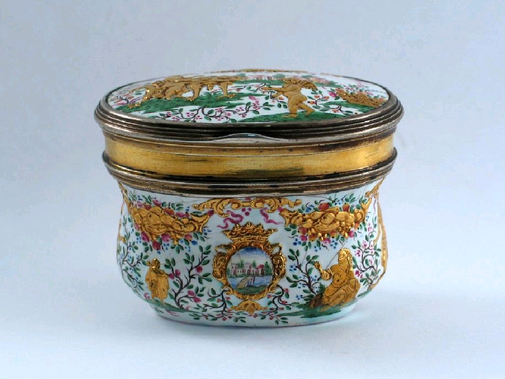An early 18th century German silvergilt mounted snuff box, with a waisted body and domed cover of painted enamels on copper, the whole encrusted with gold foil festoons of flowers, scrolls and various mythical and classical figures in their typical poses, the hinged cover set inside with a miniature painting (behind glass) depicting a lady and gentleman drinking wine and eating fruit at a table in a wood, with two dogs attendant, by Pierre Fromery, Berlin c.1730, 2.25in (5.7cm) wide.