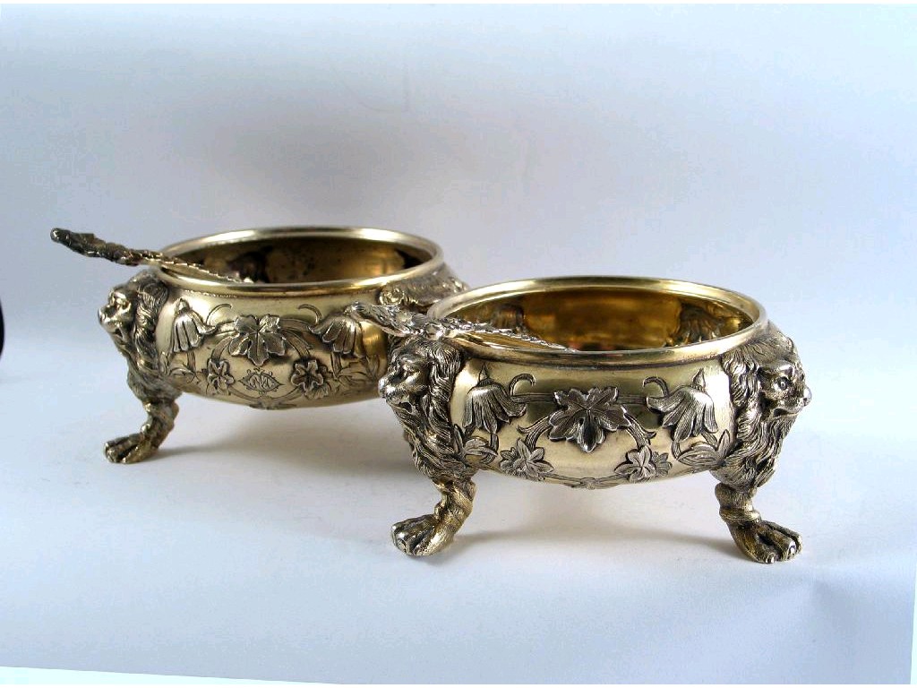 A pair of Victorian silvergilt salts on three lion mask and paw feet chased with harebell...