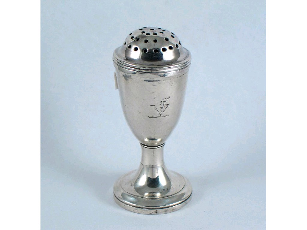 A George III small vase-shaped pepperette, with a low domed cover, crested possibly, by William Birwash (maker's mark only three times), London c.1795, 3.2in (8cm) high, 1oz,