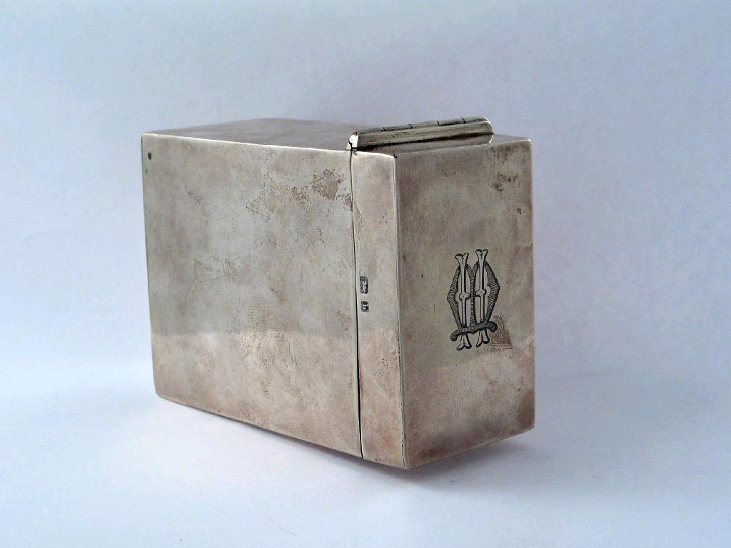 A late Victorian/Edwardian playing cards box, containing two packs, monogrammed, by Messrs Hutton, Birmingham 1901, 4in (10cm) high.