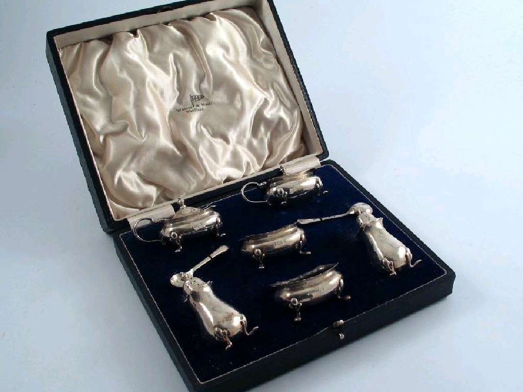 A cased modern six piece condiment set, comprising two mustard pots, two salts and two pepperettes (only three glass liners) and two non-matching plated spoons, by Walker & Hall, Birmingham 1936/38.