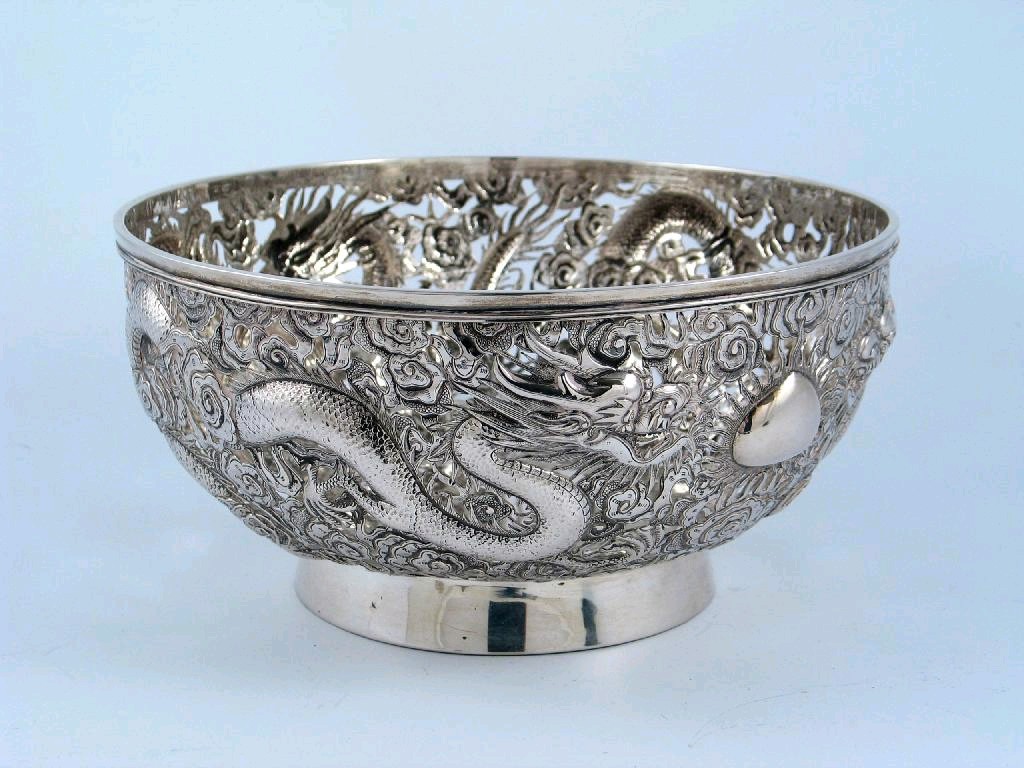 A late 19th/early 20th century Chinese rosebowl on a plain collet foot, decorated around the sides with pierced and embossed dragons amongst clouds, their heads flanking a vacant, flaming cartouche, by Wang Hing & Co, c.1900, 9.5in (24cm) diameter, 30oz.