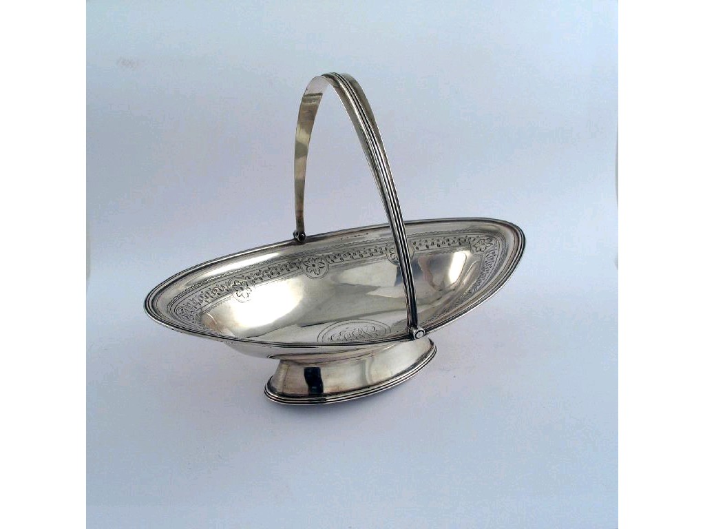 A George III swing handled sweetmeat basket, with a navette shaped bowl, engraved and reeded borders, initialled, by Naphtali Hart, London 1802, 7in (17.5cm) wide, 4oz.