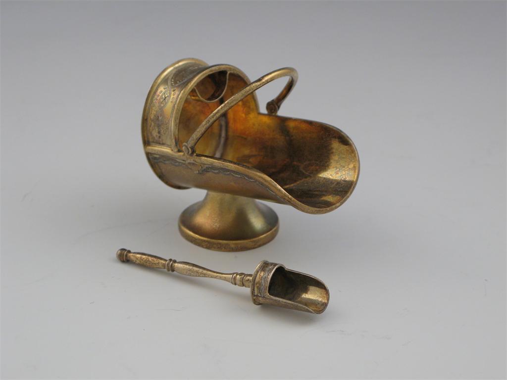 A Victorian novelty silvergilt miniature coal scuttle and scoop