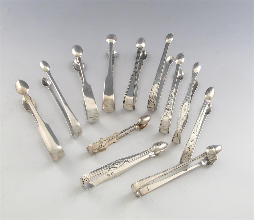 Twelve assorted sugar tongs: including four fiddle pattern pairs