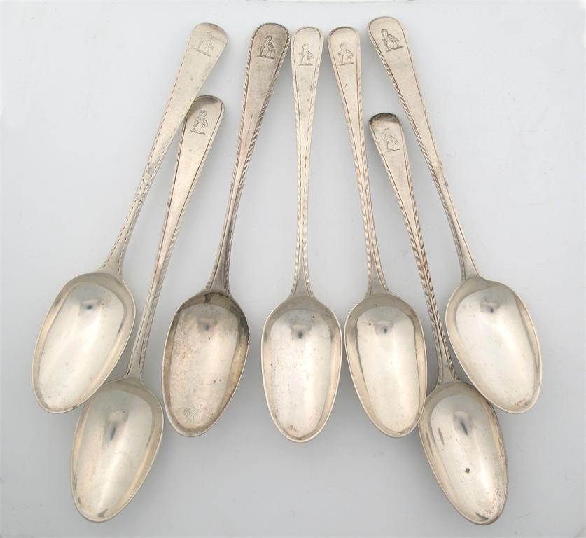 Seven various George III feather edge dessert spoons