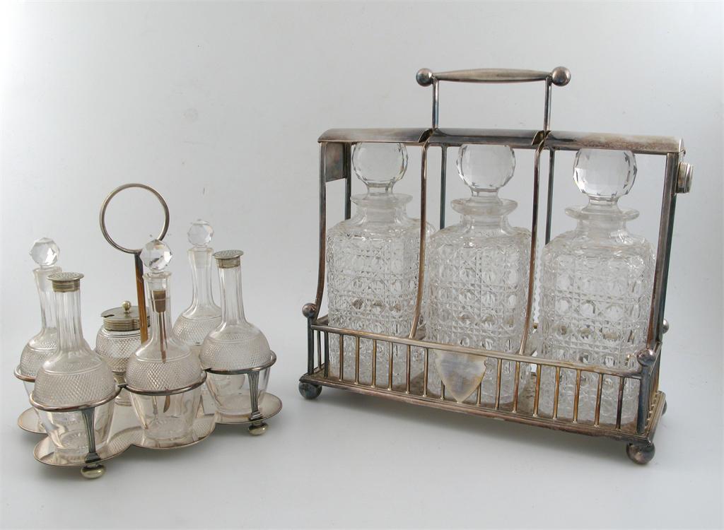 An electroplated tantalus fitted with three cut -lass
