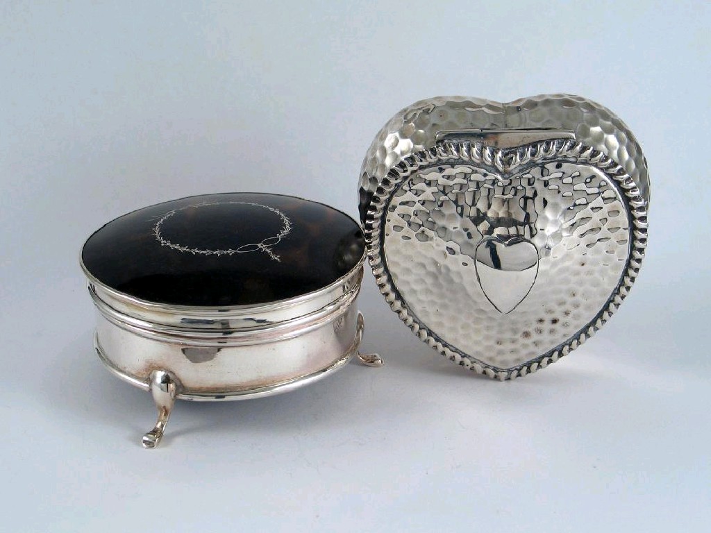 Two dressing table boxes: a late Victorian heart-shaped box with a hinged cover and a hammered finish, gilt interior, by H. Matthews, Birmingham 1897 and a circular jewel box on three feet with an inlaid tortoiseshell cover, lined and loaded, by Atkin Bros, Birmingham 1923, the latter 3in (7.75cm) diameter, 2.25oz weighable silver. (2)