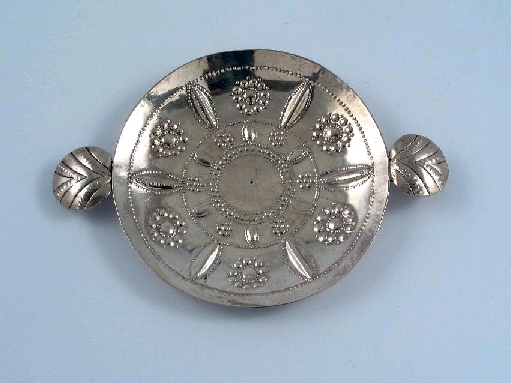 A shallow sweetmeat dish, in the form of a Charles I example with punched decoration and two small circular handles, initialled "M.T" on the underside of the rim, unmarked, probably an 18th century copy, 5.25in (13.5cm) diameter, 3oz.