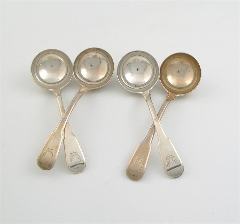 A set of four George III fiddle sauce ladles, crested by Messrs Eley Fearn and Chawner, London 1810, 8.5oz. (4)