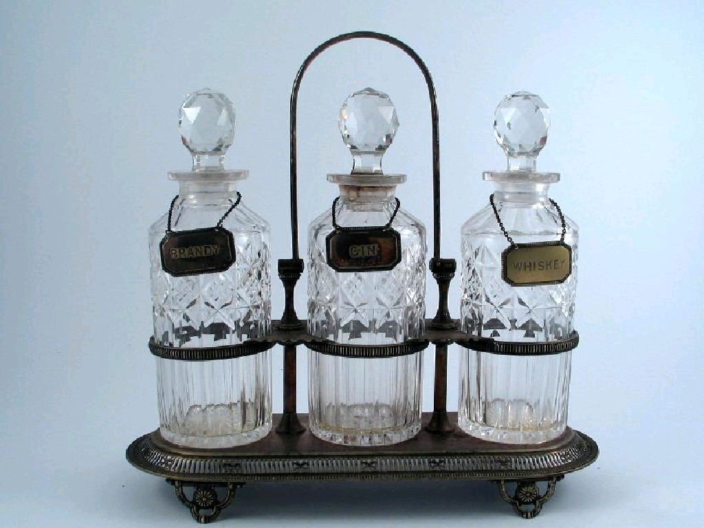 A Victorian plated decanter stand, on a pierced base with a swing handle, fitted with three cut glass decanters and stoppers and three wine labels.