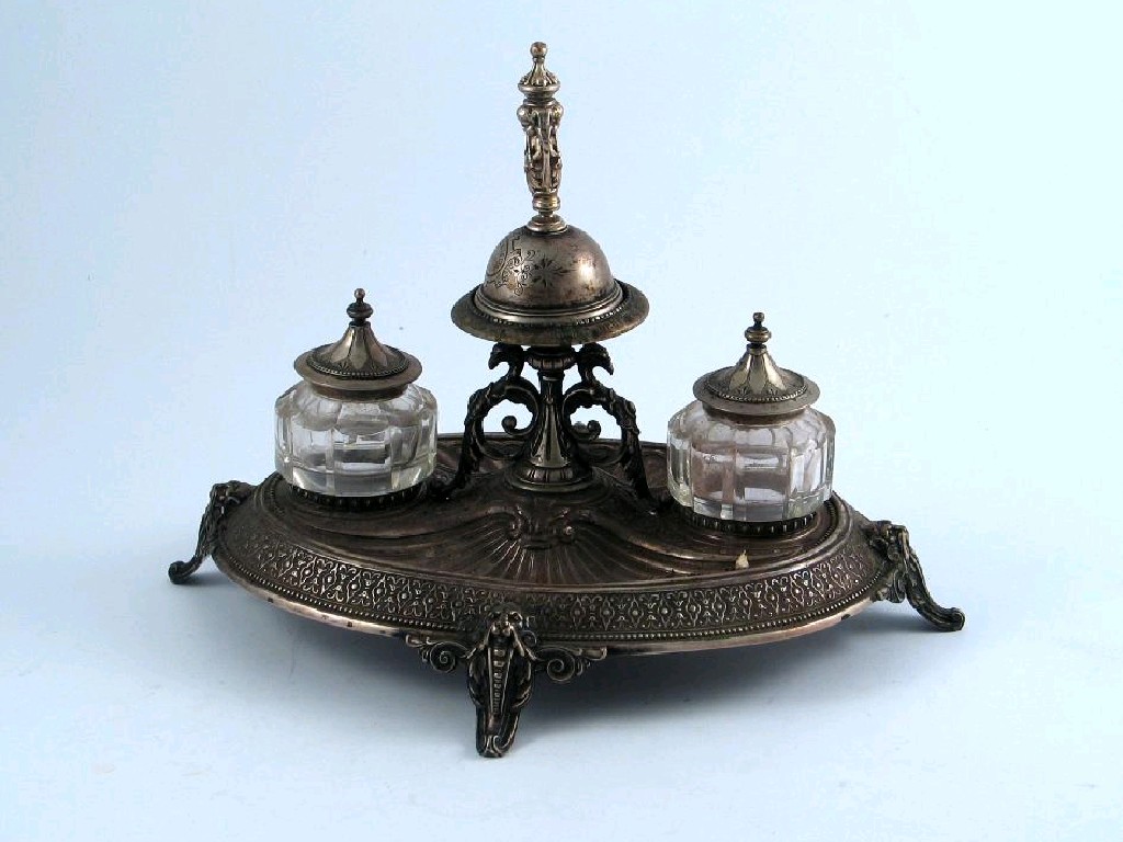 A late 19th century continental ink stand, with an oval base and four feet, fitted with a central stand surrounded by a detachable bell and flanked by two mounted cut glass inkwells with rising covers, inscribed, probably German, 11.6in (29cm), 12oz weighable silver.
