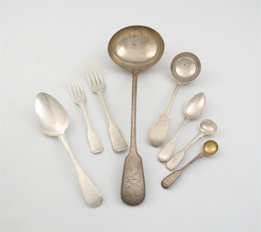 A quantity of antique fiddle and thread pattern flatware: a set of six tablespoons