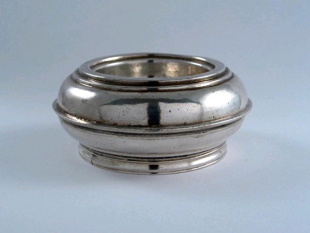 A Queen Anne West Country trencher salt, of squat circular form, pricked "S.L" on one side, by John Elston, Exeter 1711, 3in (7.5cm) diameter, 2oz.