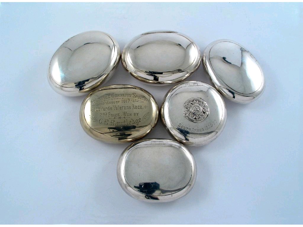 Six assorted tobacco pebbles including: a commemorative example shaped with the regimental badge of the Bedfordshire regiment, Hartfordshire militia, and inscribed 'South Africa' 1900-1902, four other plain oval examples and a plated example inscribed 'ABBEVILLE GARRISON SPORTS...100 yards veteran rose' mixed makers and dates, 12oz weighable silver. (6)
