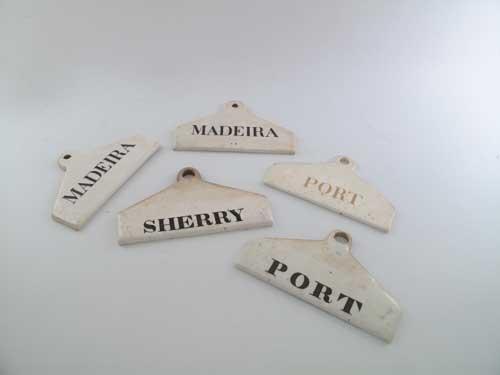 Five various glazed pottery bin labels: a Davenport 'PORT' and two 'MADEIRA' and a Minton 'PORT'...