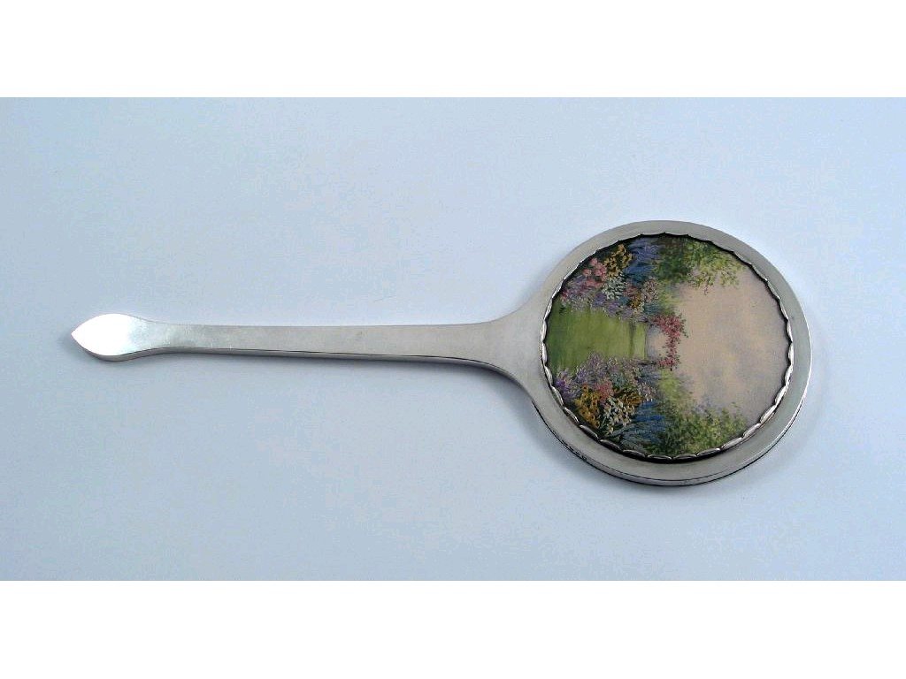 By H.G. Murphy a modern hand mirror with a plain, spear-shaped handle and a round head framing a painted and embroidered silk panel (behind glass) depicting a walkway through a garden, with flower borders and a rose arbour, the circular mirror with a bevelled border, London 1938, (loaded), 10.9in (27.7cm) long.