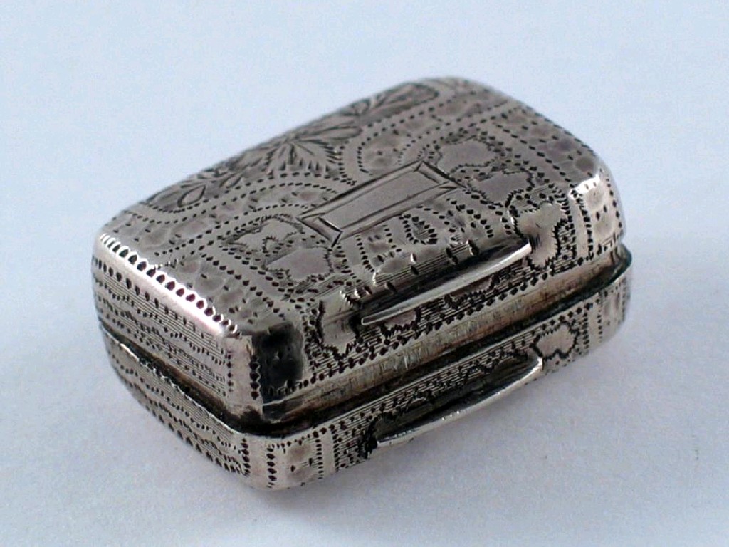 A George III small engraved vinaigrette, in the form of a bag or purse with engraving to simulate a stitched flap, by Lawrence & Co, Birmingham 1816, 0.75in (2cm) long.