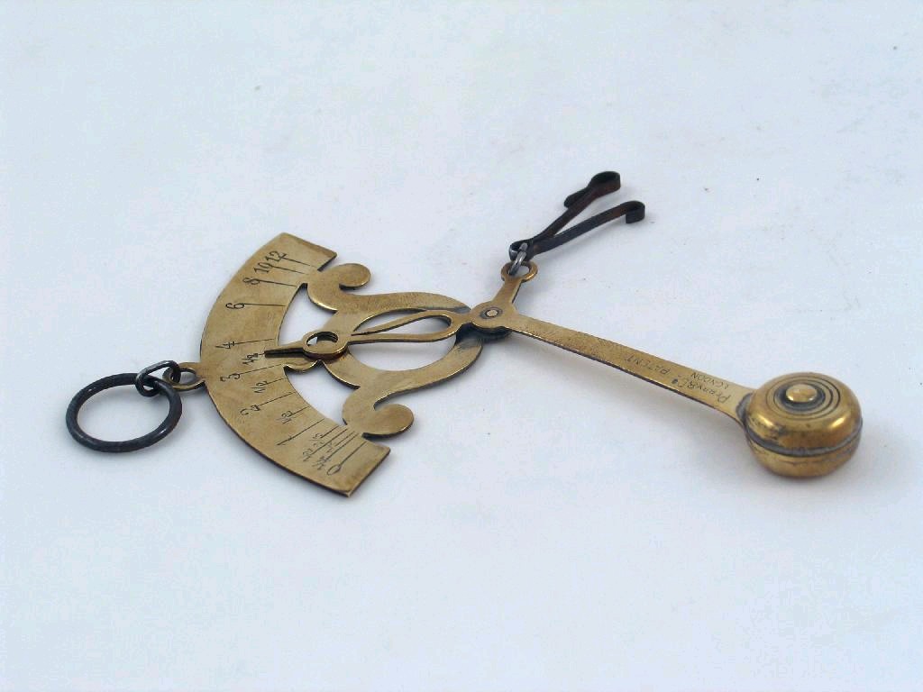 A brass Perry & Co patent postal balance with a quadrant scale