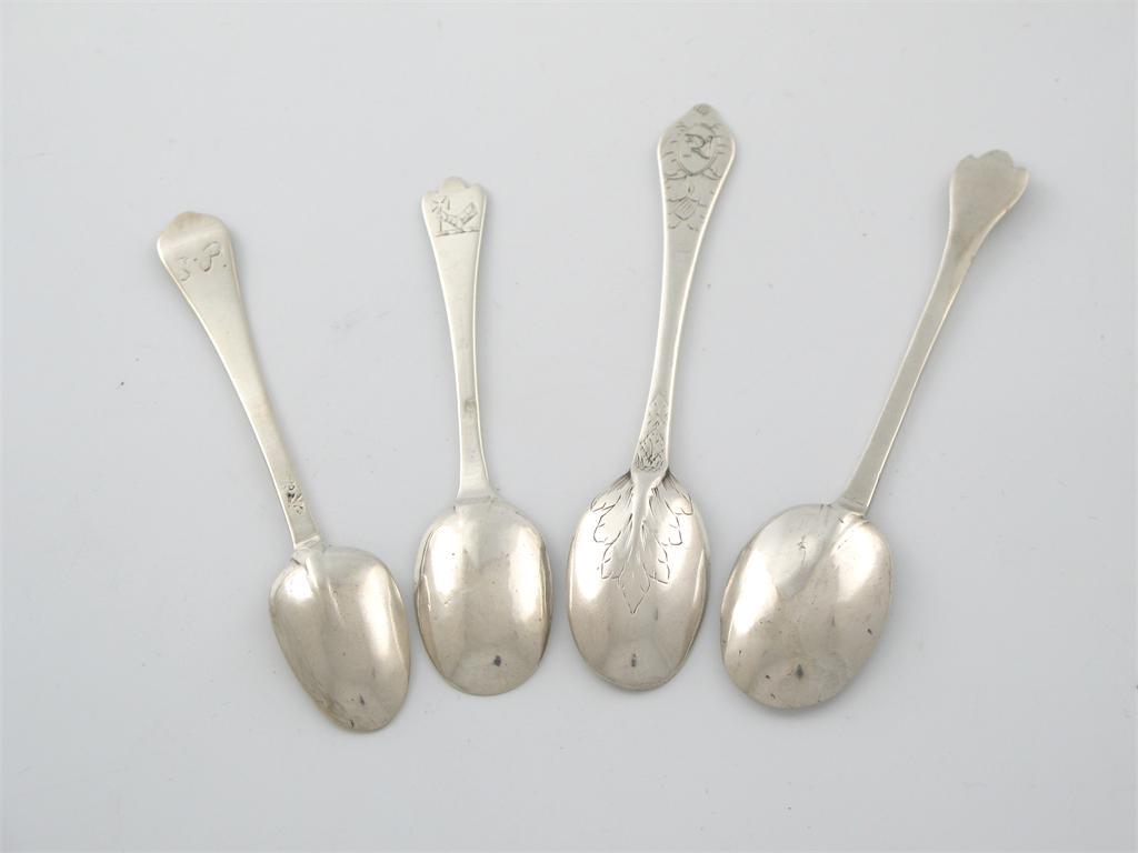 A William III wavy-end teapsoon, with engraving, monogrammed, makers mark 'IH' [crowned], London 1695 together with two small trefid spoons and a wavy end teaspoon with initials 'SP' and a indistinct makers mark, 1.5oz. (4)