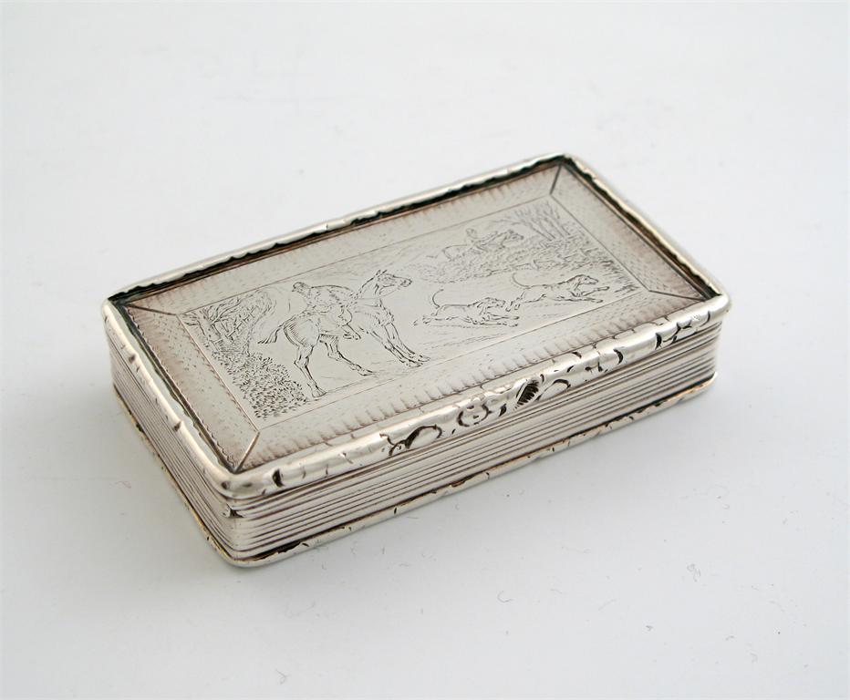 A William IV oblong snuff box, with reeded sides, the cover engraved with a fox hunting scene, by Francis Clarke, Birmingham 1836, 3.1in (8cm) long, 3oz.