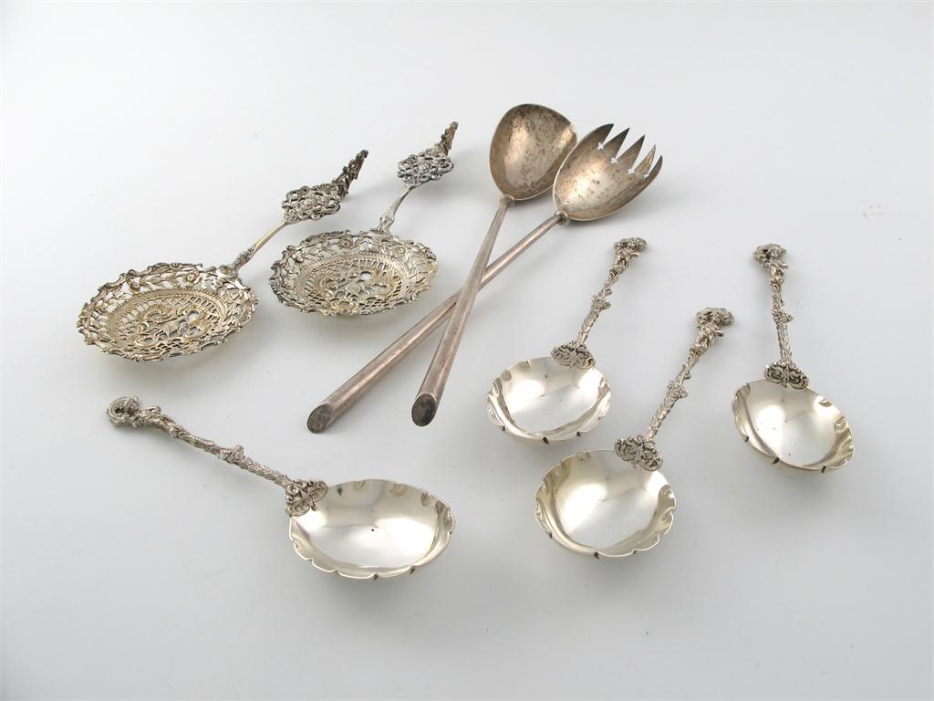 A pair of cast decorative spoons, by William Comyns, London 1891, a pair of salad servers by Messrs Hutton, London 1894 and a set of four fruit serving spoons, with cast figural stems, by W.Bibson & J.Langman, London 1894, 15oz. (8)