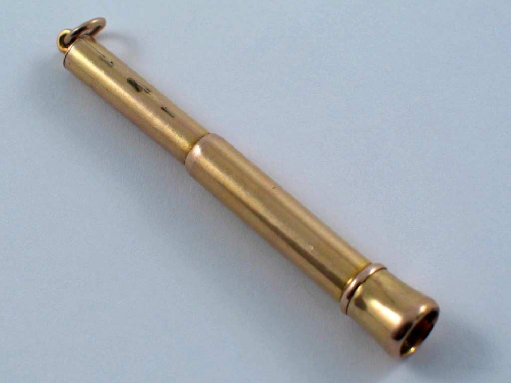 A modern gold cased cigar piercer, of plunger form with a suspensory ring, maker's mark "J.B. & Co." and another mark (distorted).