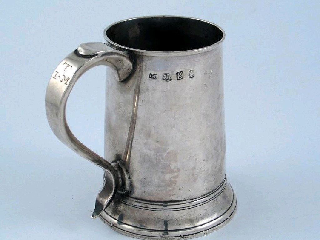 A George III tapering mug, with a skirted base and a large scroll handle, initialled "RJW" and initialled "T.I.M", on the handle, by George Gray (his mark overstriking that of Hester Bateman), London 1782, 5in (12.5cm) high, 9.75oz.