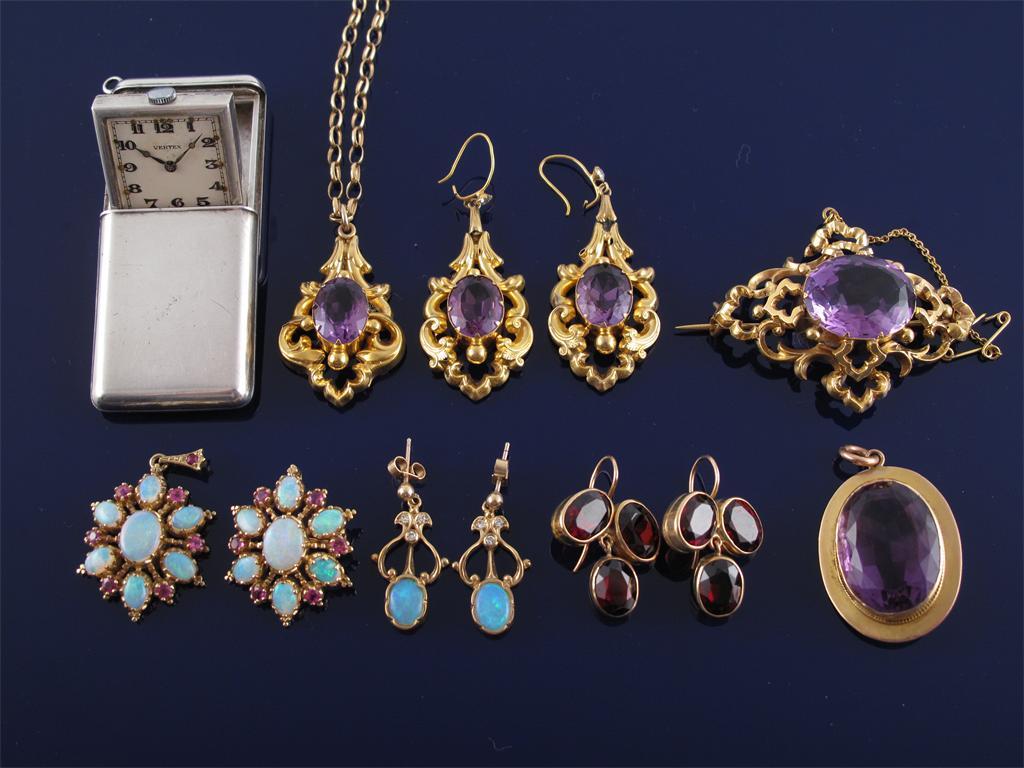 A gold brooch set with white opals and rubies. With a similar pendant. A pair of amethyst set gold drop earrings with a similar brooch and pendant on a gold chain. A pair of opal and diamond set gold earrings. An amethyst mounted gold pendant and a flip up silver travel watch by Vertex.