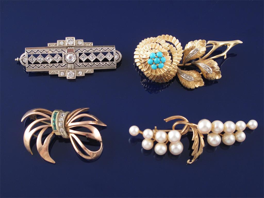 A diamond set white gold brooch. An emerald and diamond set gold bow brooch. A cultured pearl set gold brooch and a gold floral brooch set with turquoise cabochons and small diamonds. 37g in total.