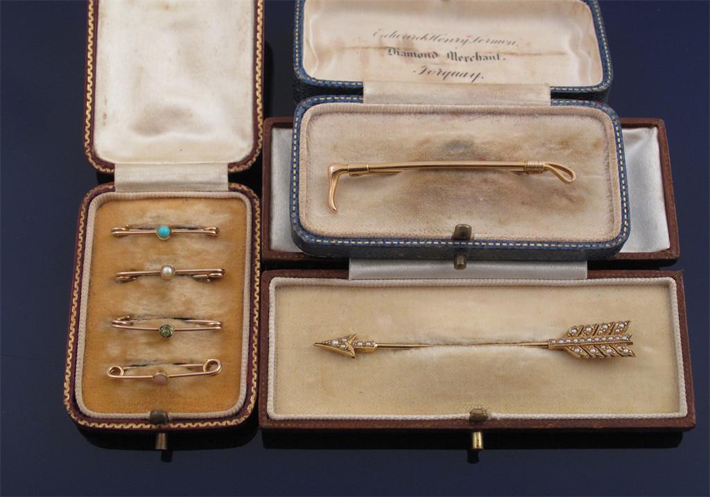 A cased set of four small gold brooches set with assorted stones. Cased. A gold riding crop brooch, cased. A seed pearls set gold jabot pin in the form of an arrow. Fitted case.