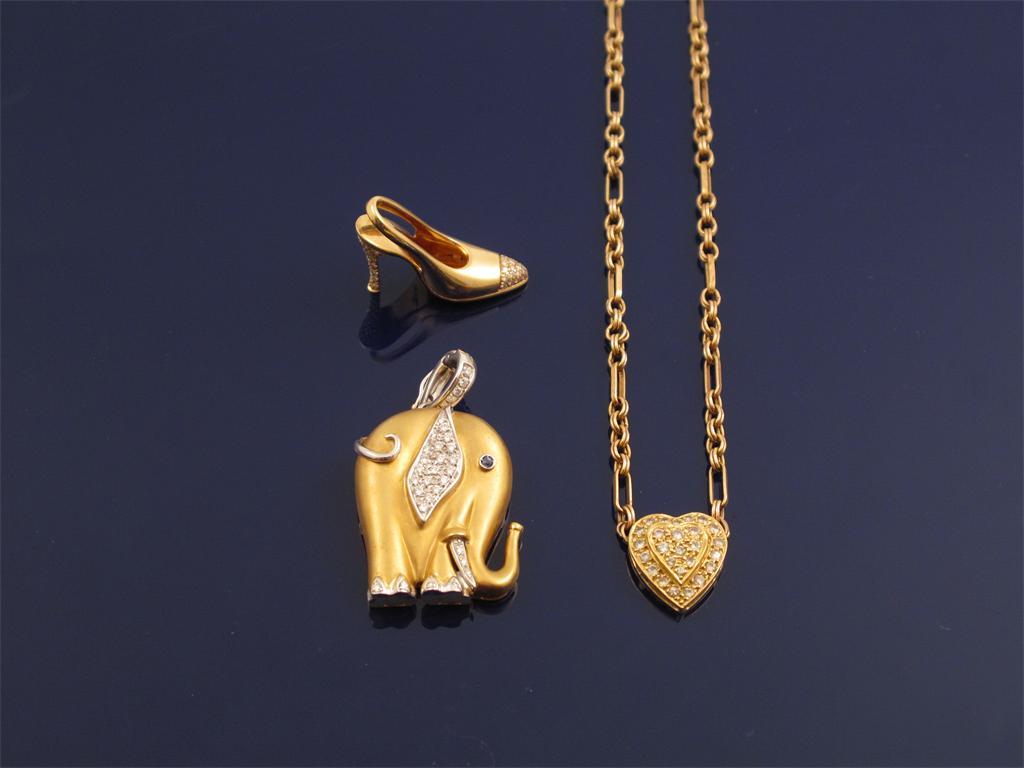 A gold elephant pendant set with diamonds and a sapphire eye, 3cm high. An 18ct gold shoe pendant set with diamonds, 3cm wide and a gold neck chain with diamond set heart pendant. The shoe and the elephant weigh 26g. The chain and heart weigh 11g.