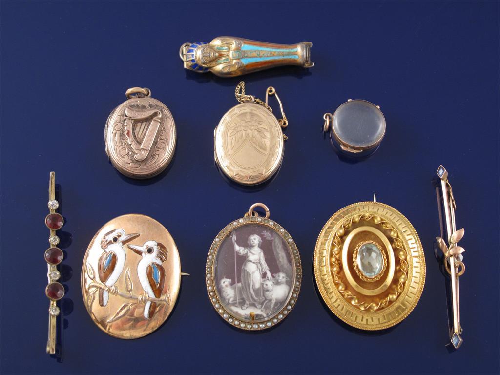An oval locket painted with a shepherdess within seed pearl border. A Victorian gold locket brooch centered with a blue stone. A mummy pendant and eight other pieces of jewellery etc.