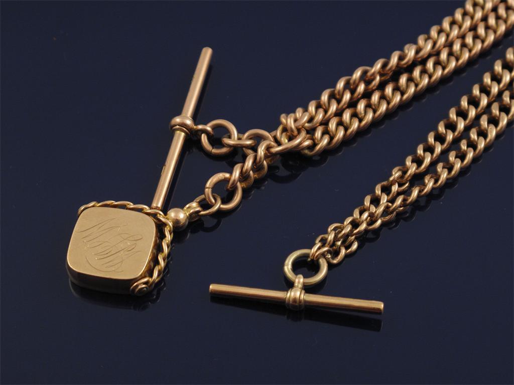 Two 9ct gold watch chains. And a gold spinning fob seal. 85g.