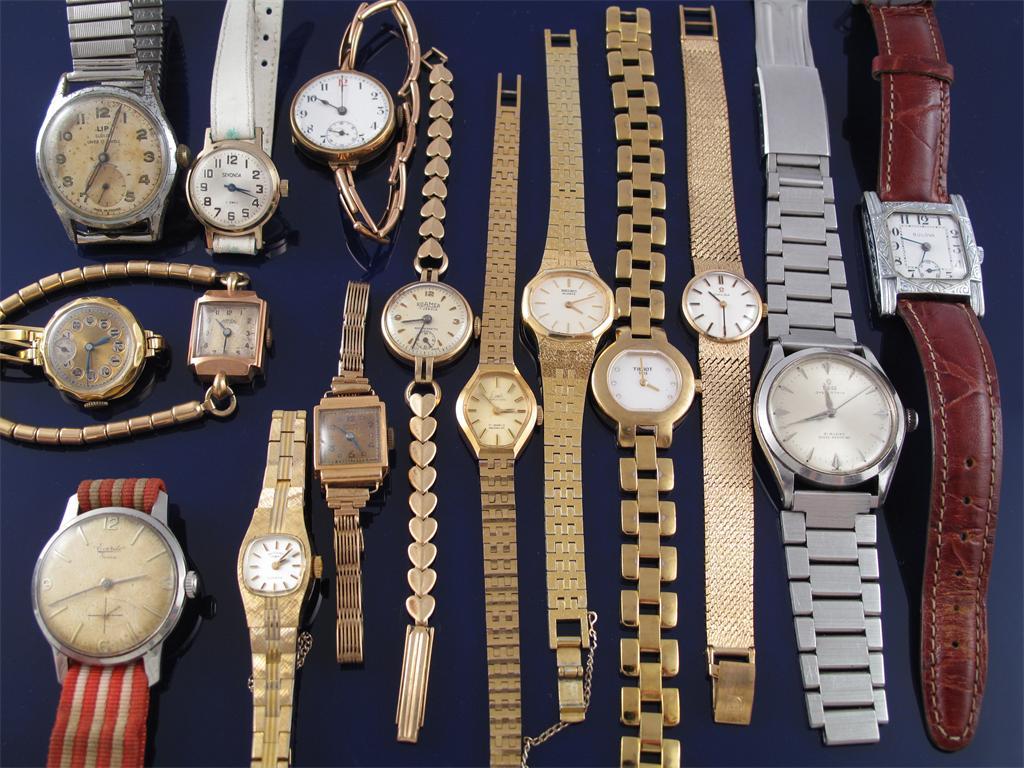 Four ladies assorted gold wristwatches with gold bands. And eleven other assorted wristwatches.