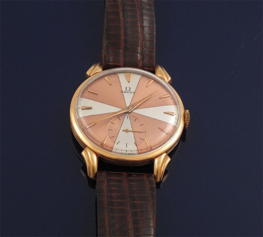A gentleman's gold wristwatch by Omega. The large circular face quartered with pink sections....