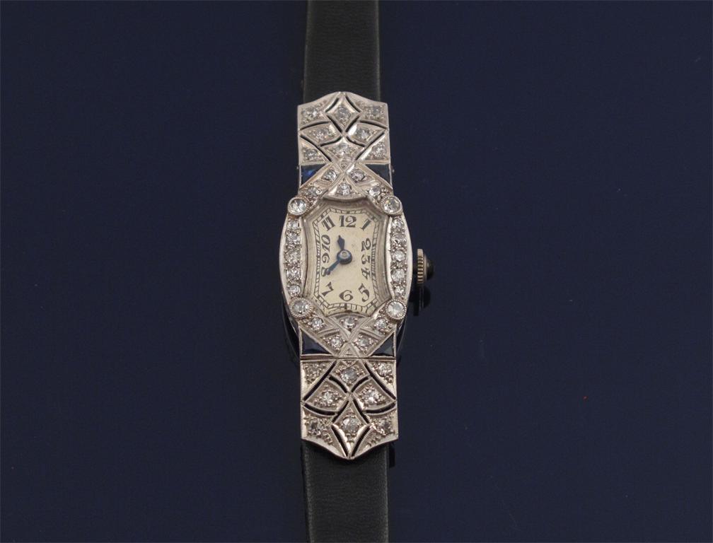 A lady's cocktail wristwatch. Set with diamonds and sapphires in platinum. Associated leather band.