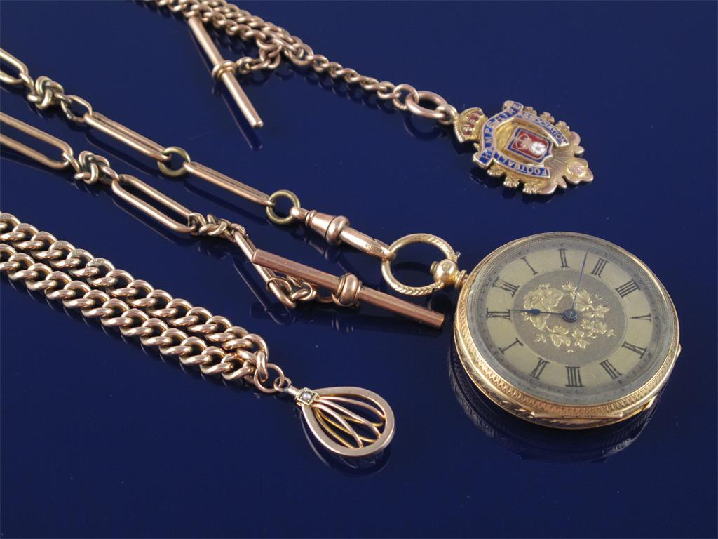 A 9ct gold curb link watch chain with gold pendant. 36g. A 9ct gold curb link watch chain with a 9ct gold medallion with enamel decoration. 37g. And a 9ct gold long and short oval link watch chain. 20g. With a gold open faced fob watch.