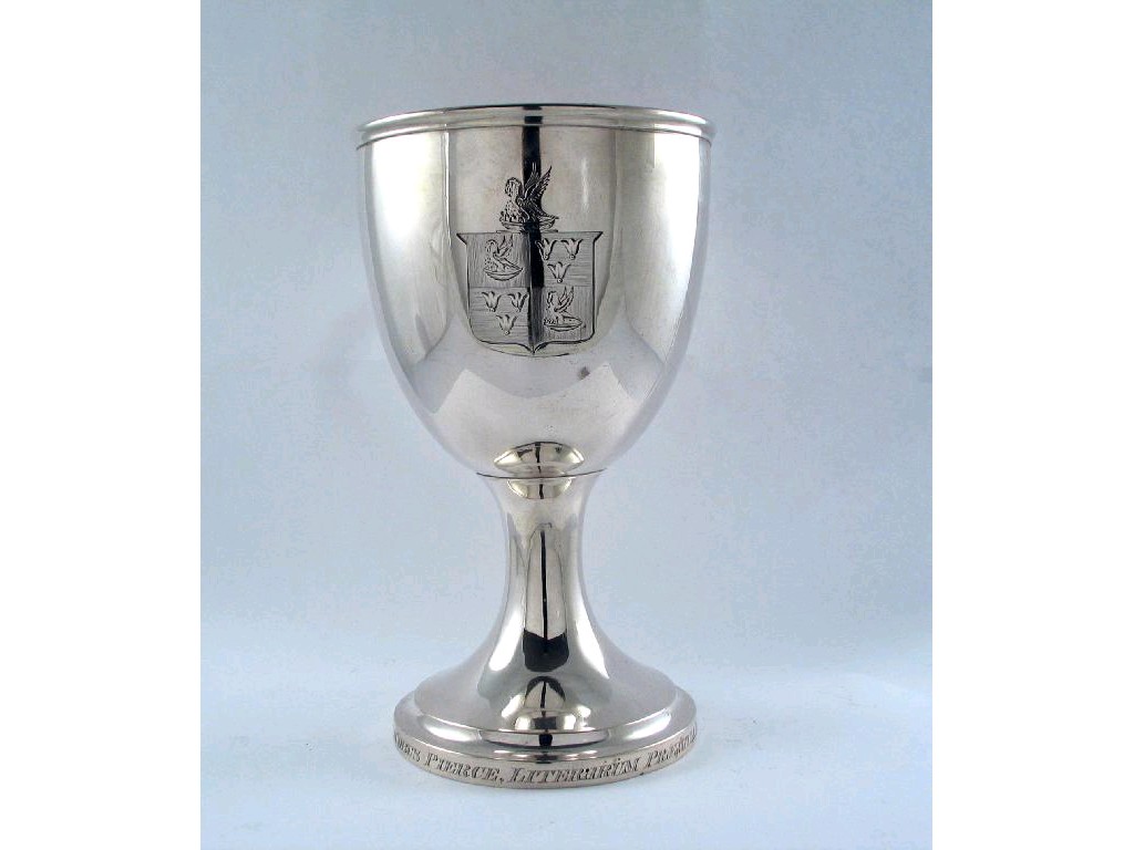A Victorian goblet, engraved with a coat of arms and the inscription "Jacobus Pierce, literarum praemium, 1854", gilt interior, by George John Richards, London 1853 (retailed by "Peters and Son, Cambridge"), 6.7in (17cm), 9oz.
